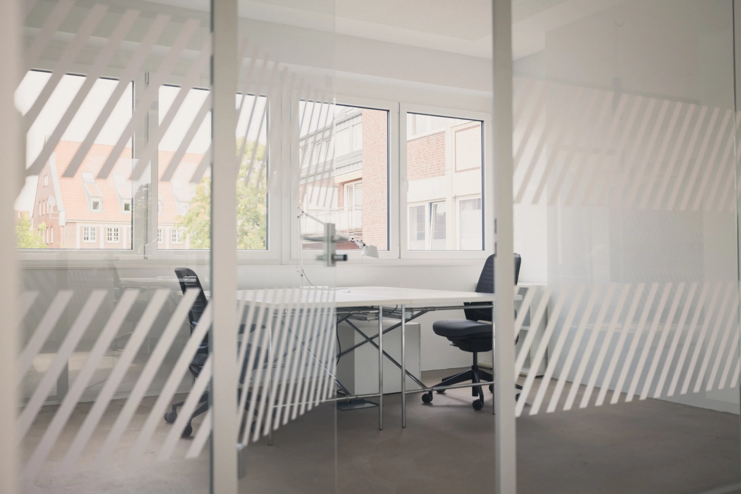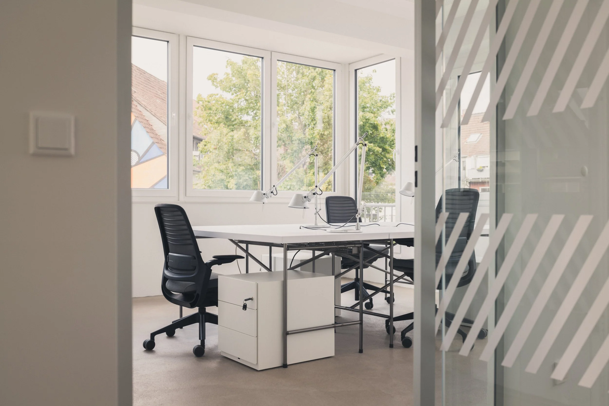 Ein einzelner Arbeitsplatz in einem geschlossenen Büro, das ihr euch zu zweit oder zu dritt teilt. Alternativ bieten wir auch feste Plätze im Großraumbüro an. Mit allem, was du erwartest, vom Eiermann-Schreibtisch bis zum abschließbaren Rollcontainer.